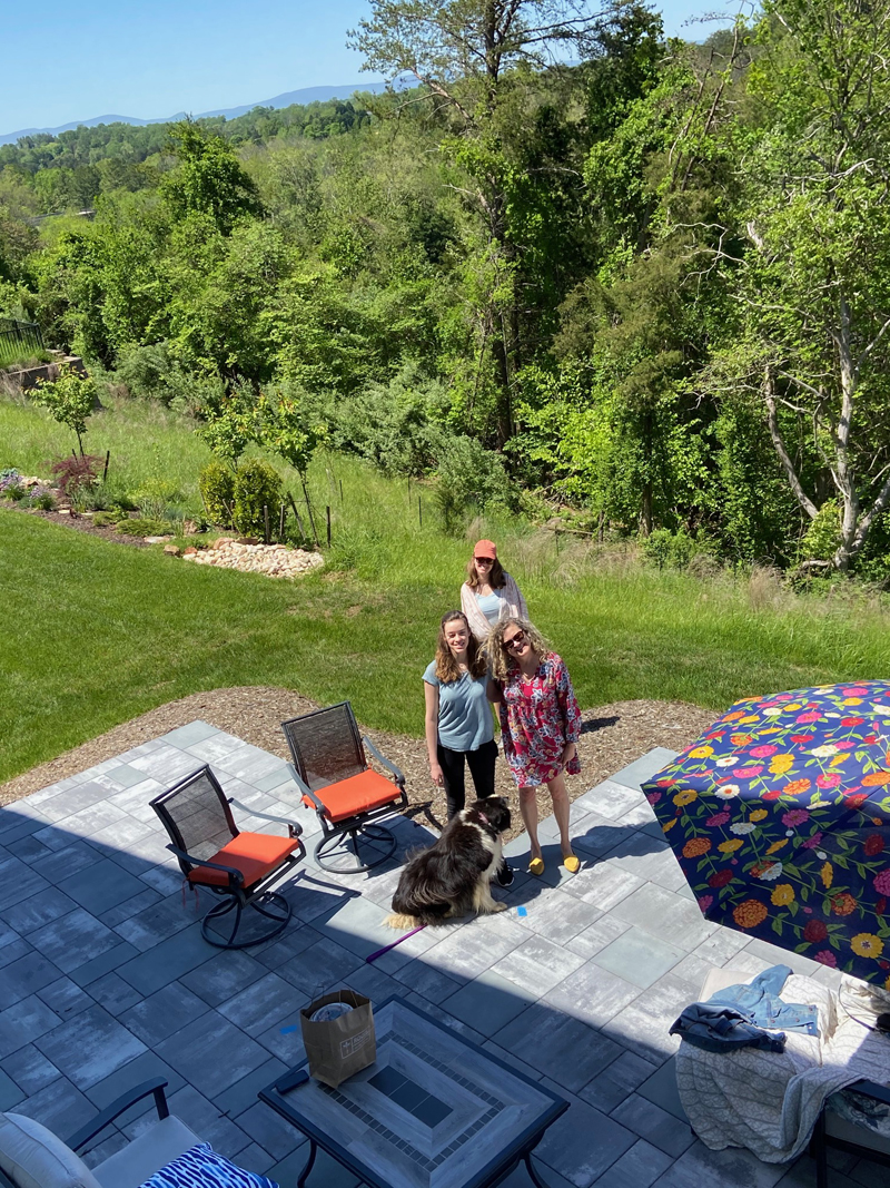 Pictured in front, Hoo sister, Julia/’21 and MomsHoo’ Ann Stewart were able to safely reconnect on a C’ville patio with their much loved and prayed for grad Hoo and UVA nurse, Christine Stewart/’19.